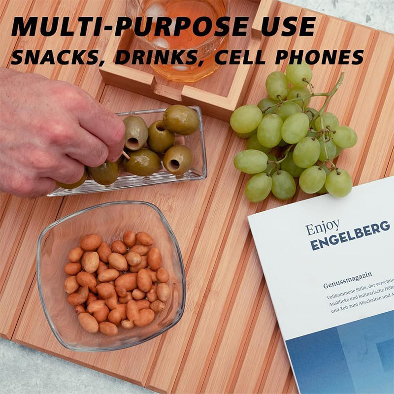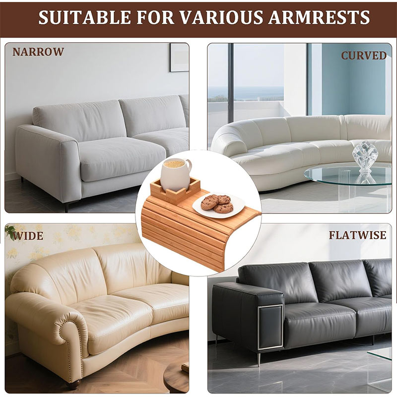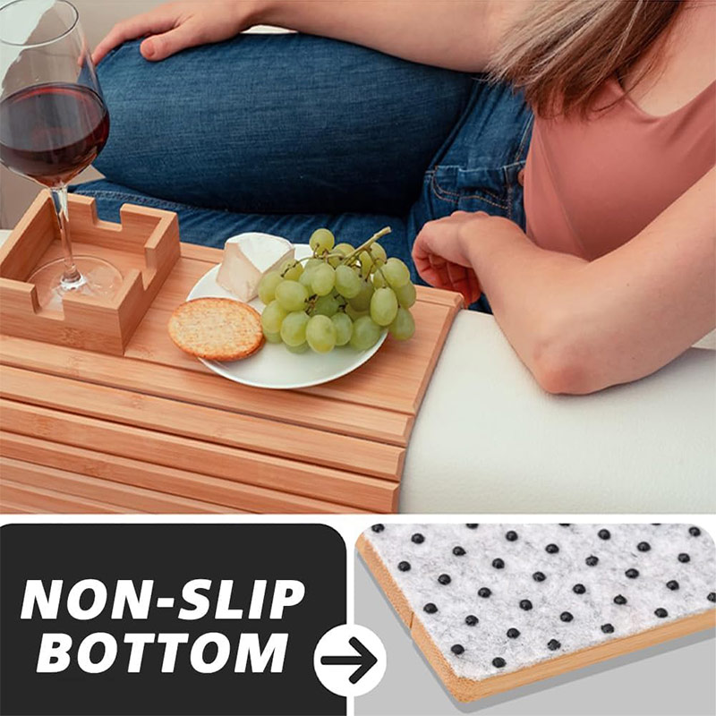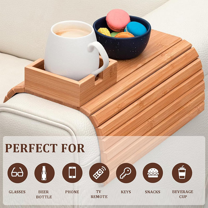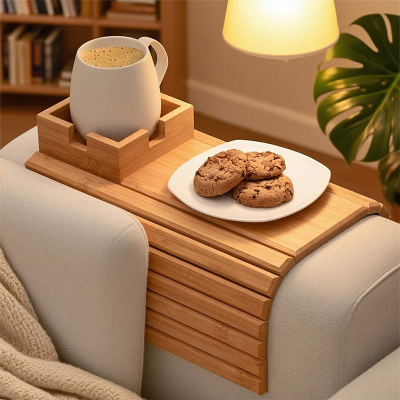 سینی دسته‌مبل چوبی؛ نگهدارنده شیک نوشیدنی، موبایل و خوراکی روی دسته مبل. ضدلغزش، سبک، جمع‌وجور و مناسب همه مبل‌ها. یک همراه کاربردی برای فیلم دیدن، استراحت و مهمانی.