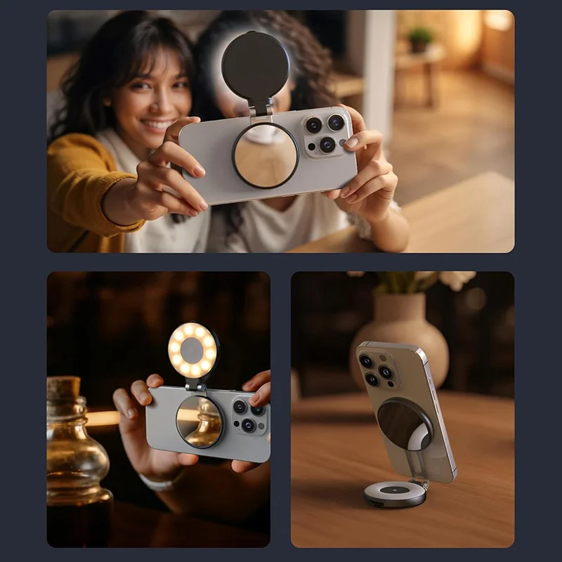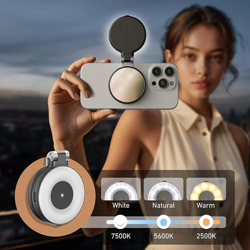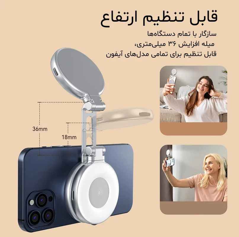 این رینگ لایت به گونهای طراحی شده که با MagSafe گوشیهای آیفون و قابهای مغناطیسی دیگر کاملاً سازگار باشد. دیگر نیازی به گیره یا پایه اضافی ندارید؛ تنها با نزدیک کردن آن به پشت گوشی، رینگ لایت محکم نصب میشود و در تمام طول استفاده ثابت باقی میماند. این قابلیت، آزادی عمل شما را افزایش میدهد و تجربهای سریع و راحت برای بلاگرها، ولاگرها و تولیدکنندگان محتوا ایجاد میکند.