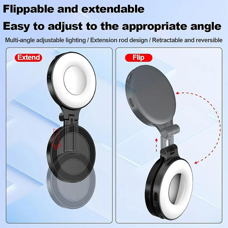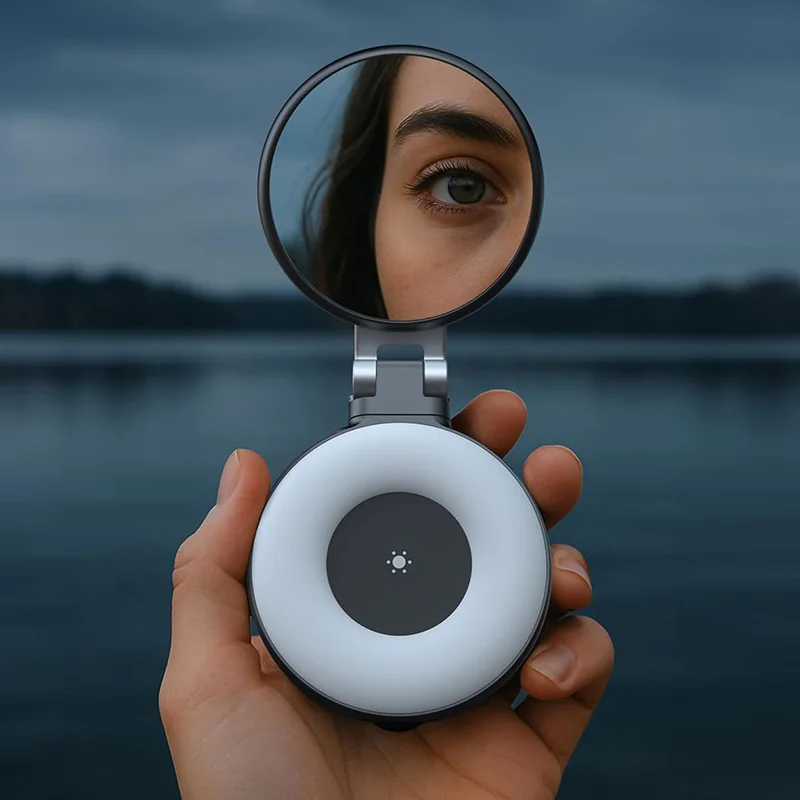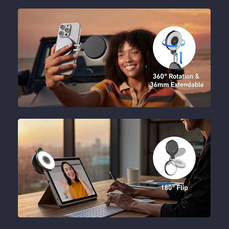 با قابلیت چرخش ۳۶۰ درجهای و بازشدن ۱۸۰ درجهای رینگ لایت، آزادی عمل فوقالعادهای دارید. میتوانید نور را دقیقاً روی صورت یا سوژه خود تنظیم کنید؛ چه برای تماس تصویری، چه برای ضبط ویدئو، عکاسی محصول یا آرایش. علاوه بر این، آینه داخلی روی درپوش رینگ لایت به شما اجازه میدهد قبل از شروع، نور و زاویه چهره خود را بررسی و تنظیم کنید.