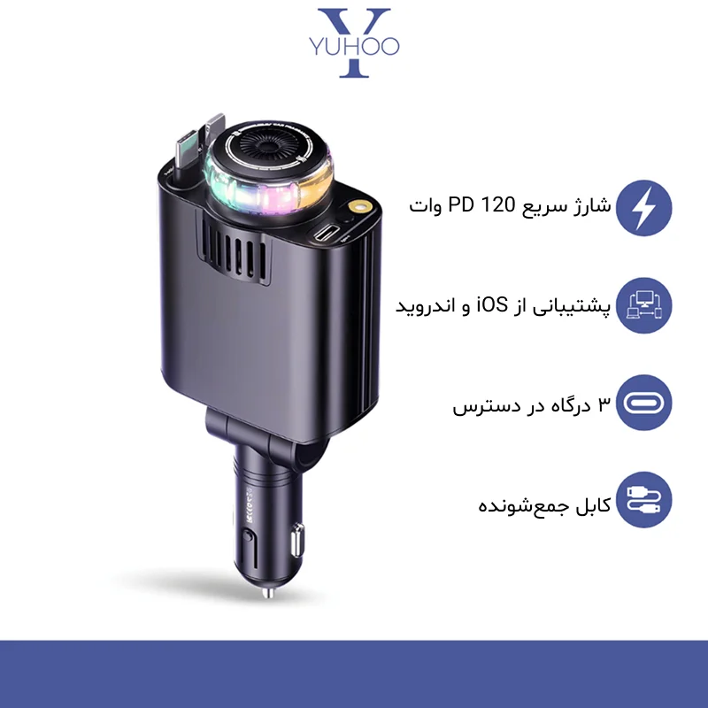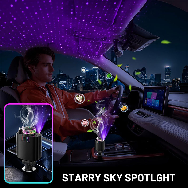 نورپردازی RGB با افکت کهکشانی، بخش دیگری‌ست که این شارژر را از مدل‌های معمول جدا می‌کند. این نورها به‌صورت ملایم تغییر رنگ می‌دهند و شب‌ها فضای کابین را به یک محیط لوکس و آرامش‌بخش تبدیل می‌کنند.