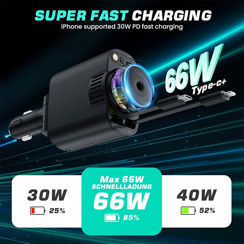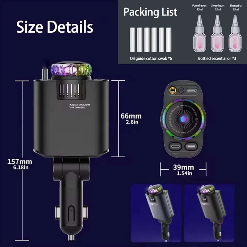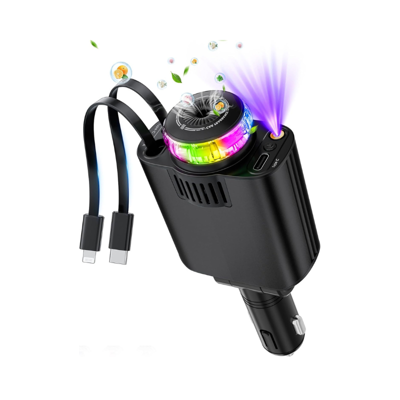شارژر فندکی W&O مدل Starlight یک گجت پنج‌کاره است که شارژ سریع ۴۵ وات، رایحه‌افشانی نانویی، کابل‌های جمع‌شونده، نورپردازی RGB و پورت USB-C را در یک دستگاه جمع کرده. مناسب برای شارژ هم‌زمان سه دستگاه، خوشبو کردن کابین و ایجاد نورپردازی جذاب در خودرو.