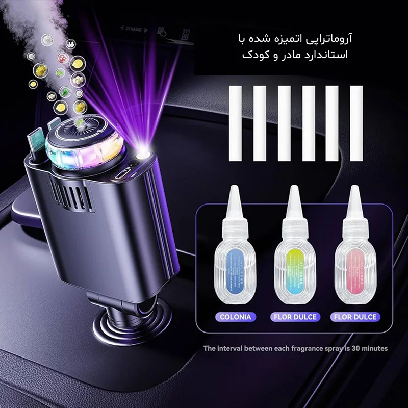 یکی از جذاب‌ترین ویژگی‌ها، رایحه‌افشانی نانویی بدون آب است. فقط چند قطره اسانس داخل محفظه بریز و دستگاه با پخش تدریجی و یکنواخت، فضای خودرو را خوش‌بو می‌کند. سه شیشه اسانس گیاهی داخل جعبه هم قرار داده شده که ماندگاری خوبی دارند و برای کودکان و افراد حساس هم ایمن‌اند.